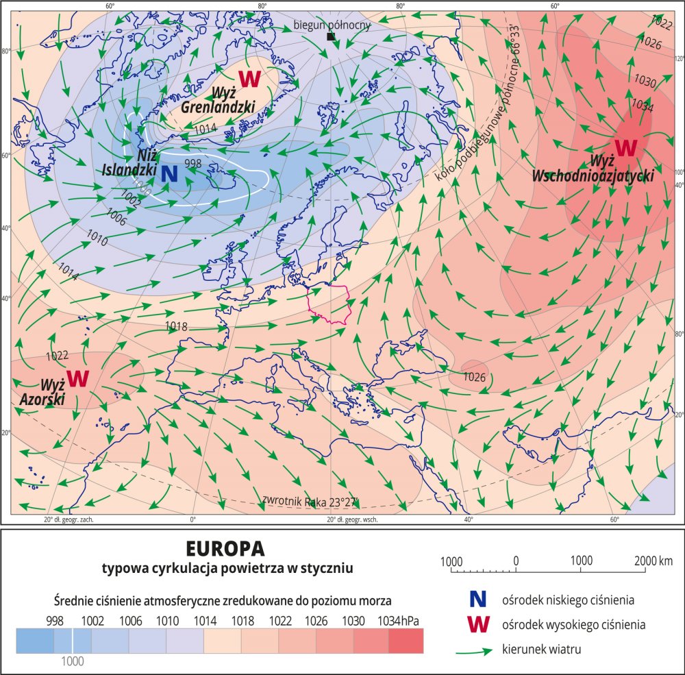 Pogoda w danym miejscu kształtowana jest głównie przez napływające masy powietrza. Do Polski powietrze dociera z różnych stron i z różną częstotliwością. O kierunku ruchu jego mas decyduje rozkład ciśnienia atmosferycznego i rozmieszczenie głównych wyżów i niżów. Powietrze płynie od wyżów do niżów. Nie jest to ruch prostoliniowy. Różne czynniki, m.in. ruch obrotowy Ziemi, sprawia, że powietrze porusza się i przemieszcza prawie równolegle do tzw. izobar, wirując wokół ośrodków barycznych. Co ciekawe, ten ruch wirowy jest inny na półkuli północnej i inny na półkuli południowej.Jeśli Wyż Azorski jest znacznie bardziej rozbudowany i znajduje się bliżej Europy, to kieruje w stronę Polski cieplejsze powietrze z kierunków południowo‑zachodnich. Często panuje wówczas bezchmurna pogodaNatomiast jeśli Niż Islandzki jest głęboki i znajduje się nad Europą Północną, to ściąga do nas chłodne i wilgotne powietrze atlantyckie, a temu towarzyszą zwykle towarzyszą silne wiatry.Wzajemne położenie Wyżu Azorskiego i Niżu Islandzkiego sprawia, że do Polski najczęściej napływają wilgotne masy powietrza polarno‑morskiego znad Oceanu Atlantyckiego. W zimie charakteruzują one ocieplenie i opady śniegu lub deszczu, a latem – ochłodzenie i opady deszczu oraz wiatry.