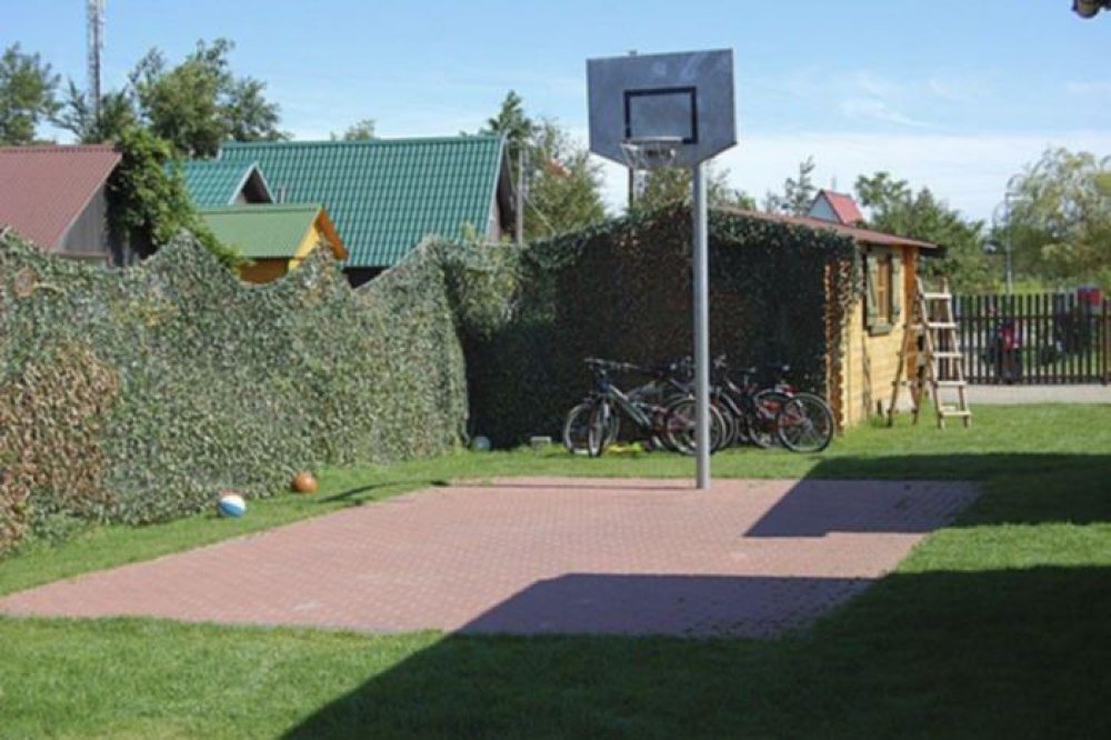 Dla dzieci przygotowano kącik zabaw z piaskownicą, huśtawkami i zjeżdżalnią oraz boisko do koszykówki.