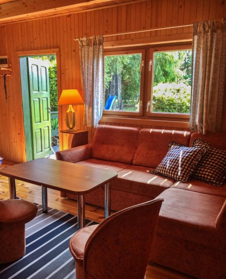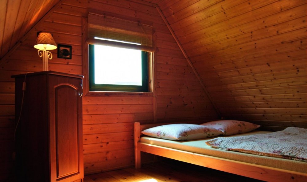 Domki składają się z dwóch poziomów i mieszczą od 4- 6 osób (dorośli i dzieci łącznie). Na parterze znajduje się pokój dzienny z telewizorem (TV - naziemna), wyposażony aneks kuchenny: (lodówka, kuchenka gazowa, czajnik, naczynia, garnki itp.), łazienka: (kabina prysznicowa, wc typu kompakt, umywalka, lustro) i wygodny taras z wyjściem na ogródek. Na piętrze są dwie 2-osobowe sypialnie, w tym jedna z balkonem.