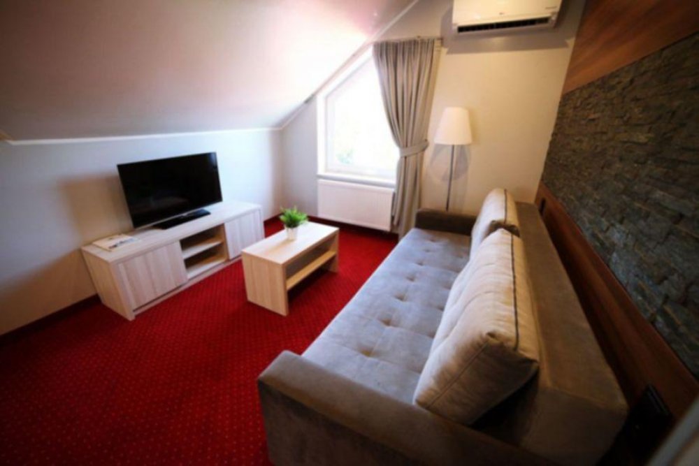Nasz hotel dysponuje 31 pokojami. 21 z nich to pokoje 2-osobowe, pozostałe 6 to pokoje 3-osobowe, wszystkie z możliwością dostawki lub do pojedynczego wykorzystania. Posiadamy również 4 przestronne rodzinne apartamenty. Każdy z nich składa się z sypialni, pokoju dziennego oraz łazienki (w sumie ok.40m2). Usytuowane są na poddaszu, nie posiadają balkonów są natomiast w pełni klimatyzowane.
