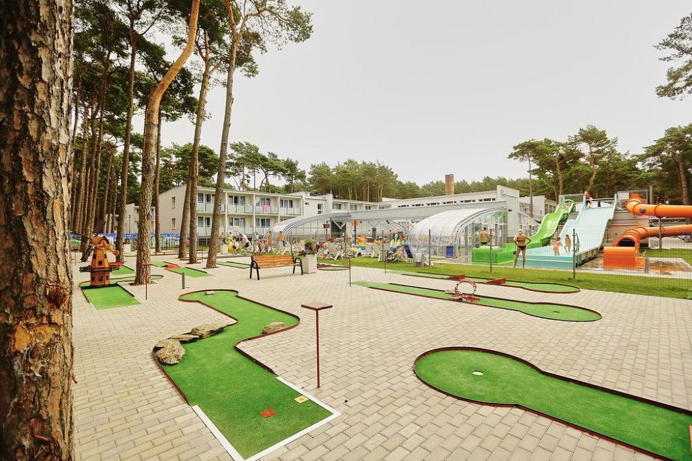 - aquapark, na który składają się: zadaszony basen, trzy zjeżdżalnie, brodzik z podgrzewaną wodą, spray park z mnóstwem zabawek i armatek wodnych oraz jacuzzi