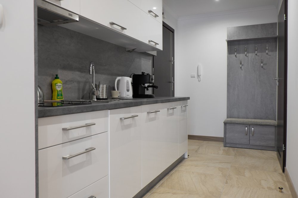 W przedpokoju znajduje się wieszak na kurtki i płaszcze, szafka na buty, wyświetlacz do sterowania ogrzewaniem w apartamencie.